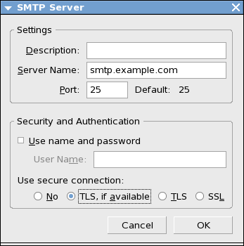 По този начин, ако TLSv1 не се поддържа от SMTP сървъра, ще се премине автоматично към свързване без използване на сертификатно удостоверяване и криптиране на комуникационния канал. Ако потребителят е сигурен, че SMTP сървъра поддържа протокола TLSv1, той може да укаже това като избере опцията "TLS":